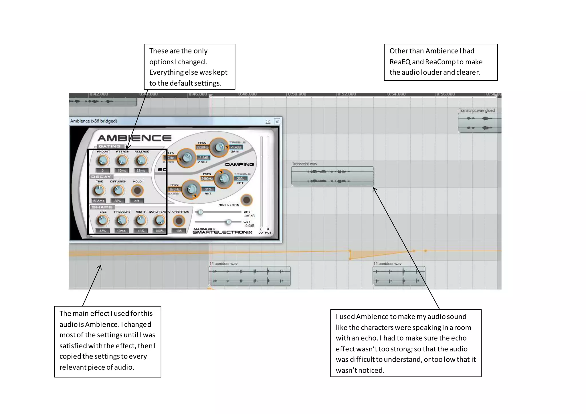 The document discusses applying audio effects to make recorded dialogue sound more realistic. Specifically, the author used an Ambience effect to add a subtle room echo, and tested different settings until finding a balance that was noticeable but didn't overwhelm the audio. In addition, the author used ReaEQ and ReaComp effects to increase the volume and clarity of the audio while keeping other settings at their defaults.