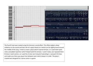 The document describes a musical track created for a tense game scene using the Extractor sound effect to add ambience and a space theme. Lower pitch notes were repeated to build tension, with 3 notes pressed 8 times each in sections of equal time between notes to maintain order. The piece was intended to inspire tension for a game through its effects, notes, and repetition.