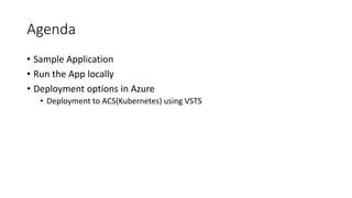 This document provides an agenda for running a sample .NET Core application locally in containers and deploying it to Azure Kubernetes Service using Visual Studio Team Services. It discusses running the Dockerized application locally in Docker Tools for Visual Studio or IntelliJ and debugging containers. It also provides an overview of key Kubernetes concepts like pods, replication controllers, deployments and services for deploying the containerized application to AKS.