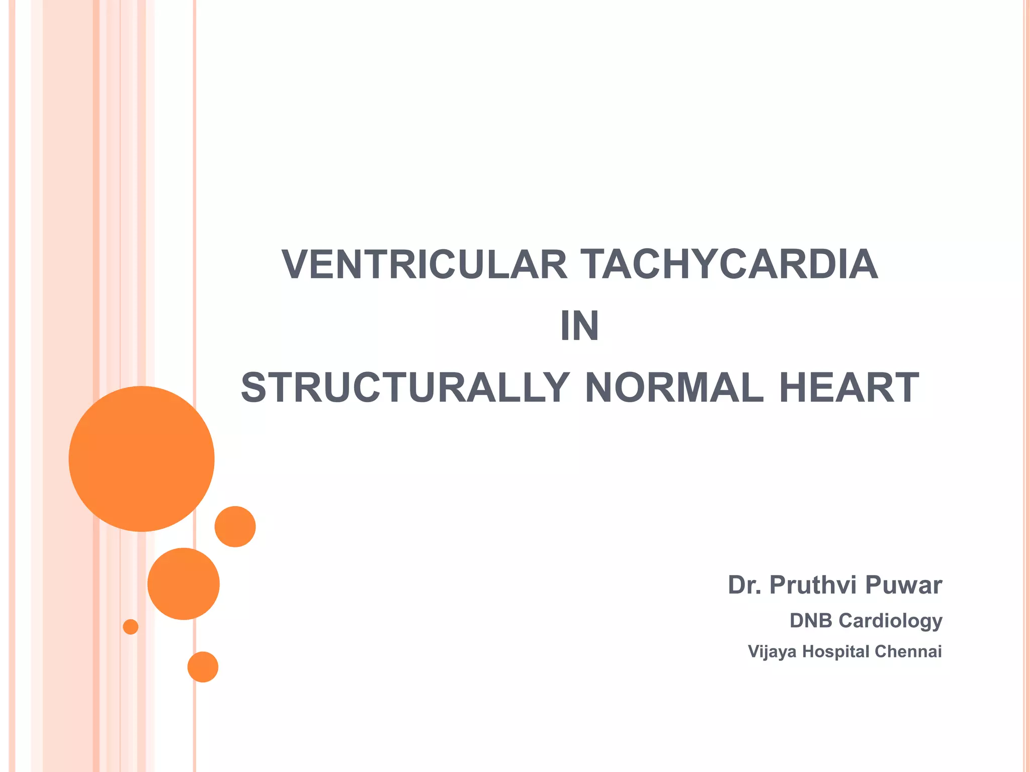 The document discusses ventricular tachycardia (VT) in patients with structurally normal hearts, outlining its definitions, types, diagnosis, and management strategies. It emphasizes the differentiation between VT and supraventricular tachycardia (SVT), as well as the clinical significance of ECG patterns and recent algorithms for improved diagnosis. Treatment options range from acute interventions like carotid sinus massage to long-term strategies including beta-blockers, catheter ablation, and consideration for implantable cardioverter-defibrillators in high-risk cases.
