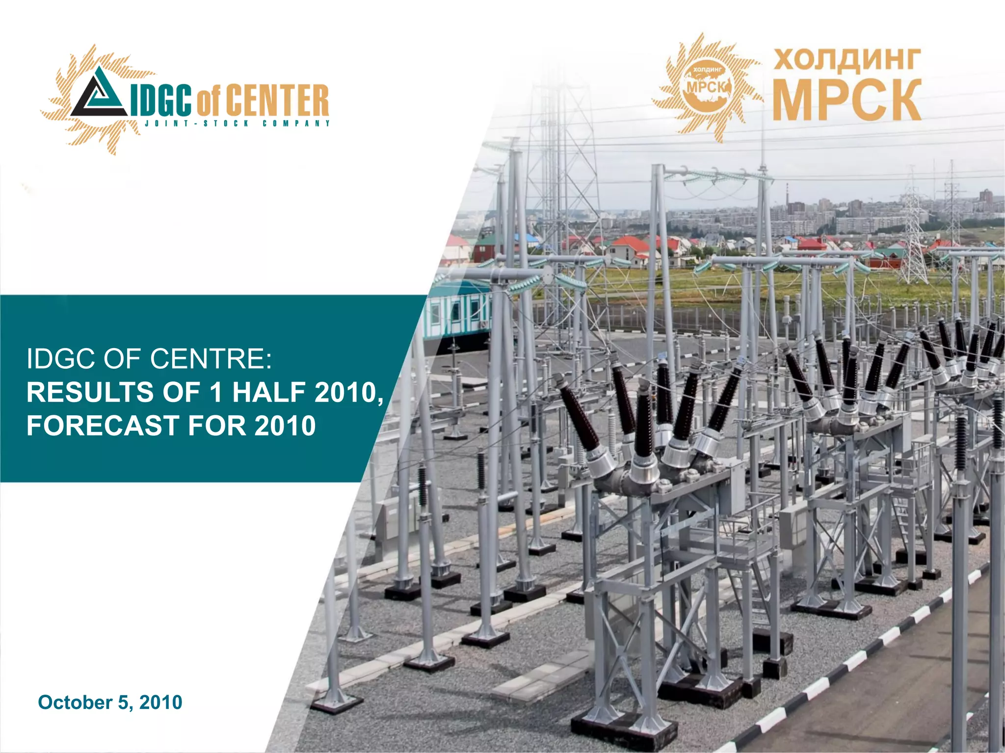 The document provides results for the first half of 2010 and forecasts for the full year 2010 for IDGC of Centre. Key highlights from the first half of 2010 include revenue of RUR 29.4 billion and net profit of RUR 2.5 billion. Forecasts for 2010 were not provided in quantitative terms. The document also outlines the company's operations, management structure, shareholder base, and other financial details such as credit ratings and stock market performance.