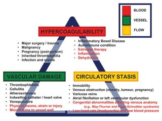 This document provides an overview of venous thromboembolism (VTE) including deep vein thrombosis (DVT) and pulmonary embolism (PE). It discusses risk factors, diagnostic criteria and scoring systems, diagnostic testing including D-dimer and imaging, differential diagnoses, management including anticoagulation options, prevention, and special considerations. The objectives are to review VTE, risks, scoring, diagnosis of DVT and PE, and management approaches. Medical education aims to ensure community health, not just provide career training.