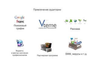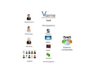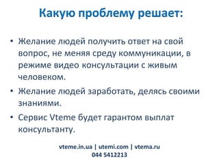 Документ описывает сервис vteme, который предоставляет возможность видео консультаций между консультантами и клиентами с гарантией выплат. Указаны краткосрочные, промежуточные и долгосрочные цели сервиса, а также анализ конкурентов и их преимущества и недостатки. Также представлены данные о CEO компании и инвестиционных этапах для развития платформы.