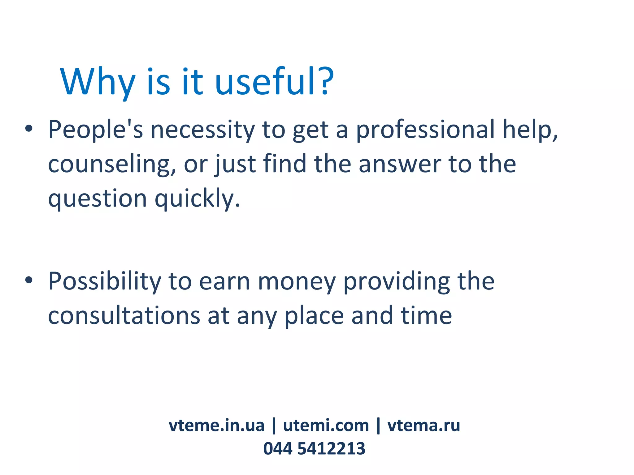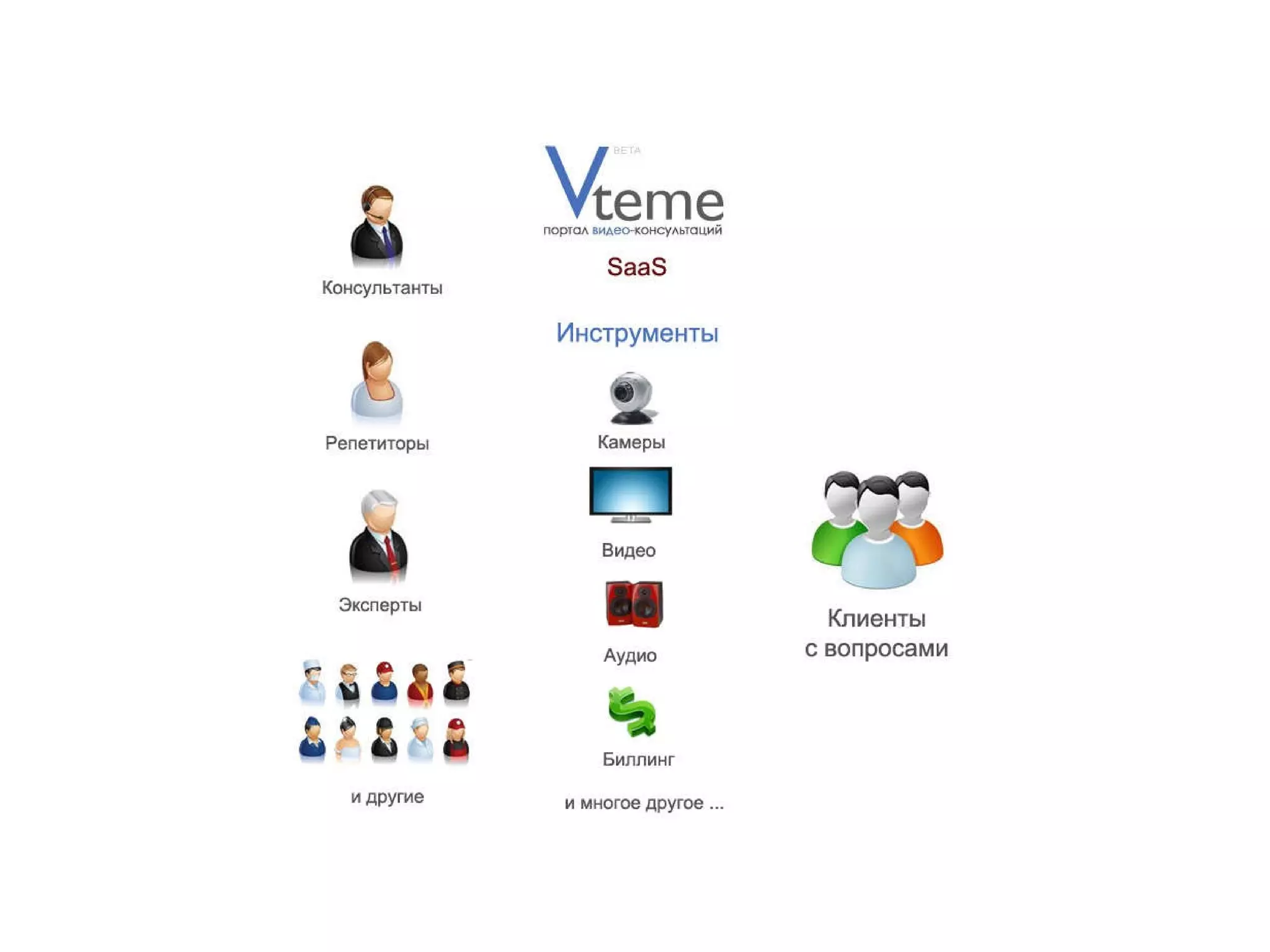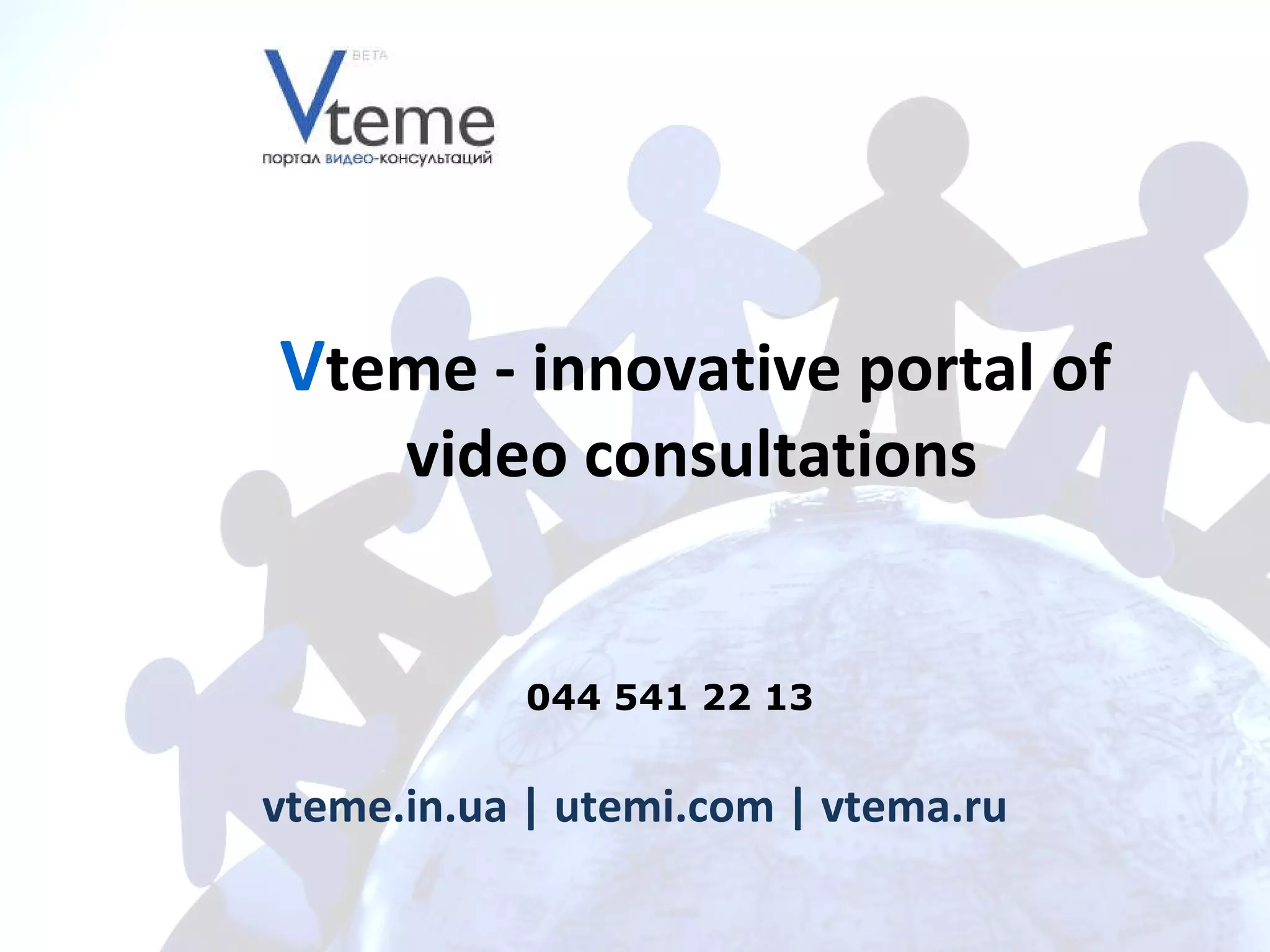 Vteme is an innovative online video consultation portal that allows users to get professional help, counseling, or answers to questions quickly from consultants. The service aims to spread to CIS countries in the short term and improve the mobile experience in the medium term, with an eventual goal of international promotion. The founders have developed unique Flex software and invested their own money to build the platform and team. They believe the online consultation market is large and growing globally and in Ukraine.