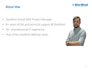 The document discusses StarWind Virtual Tape Libraries (VTL) which can provide 10x faster backups. It outlines an upcoming webinar on VTLs, including an introduction to how tape backups have evolved, how VTLs allow backups to fit within 24/7 production environments by virtualizing tape, and an explanation of disk-to-disk-to-tape backup. The webinar will include a demo and Q&A session.
