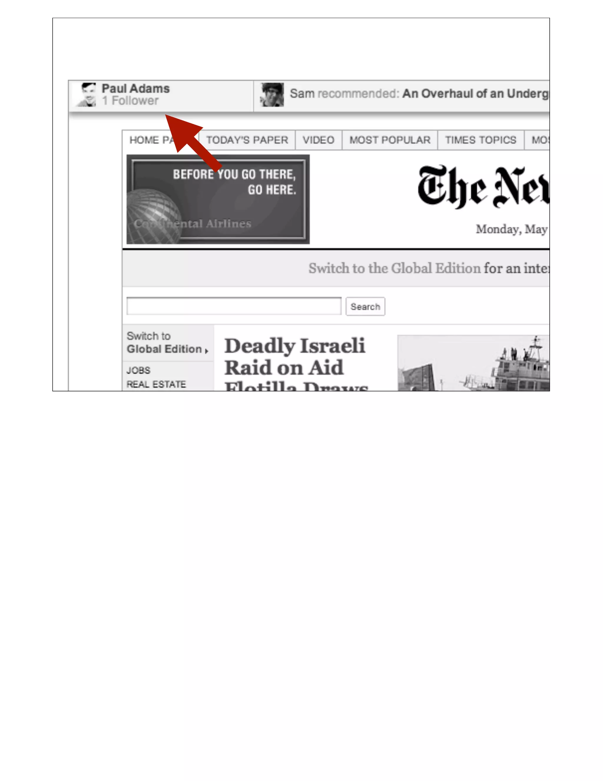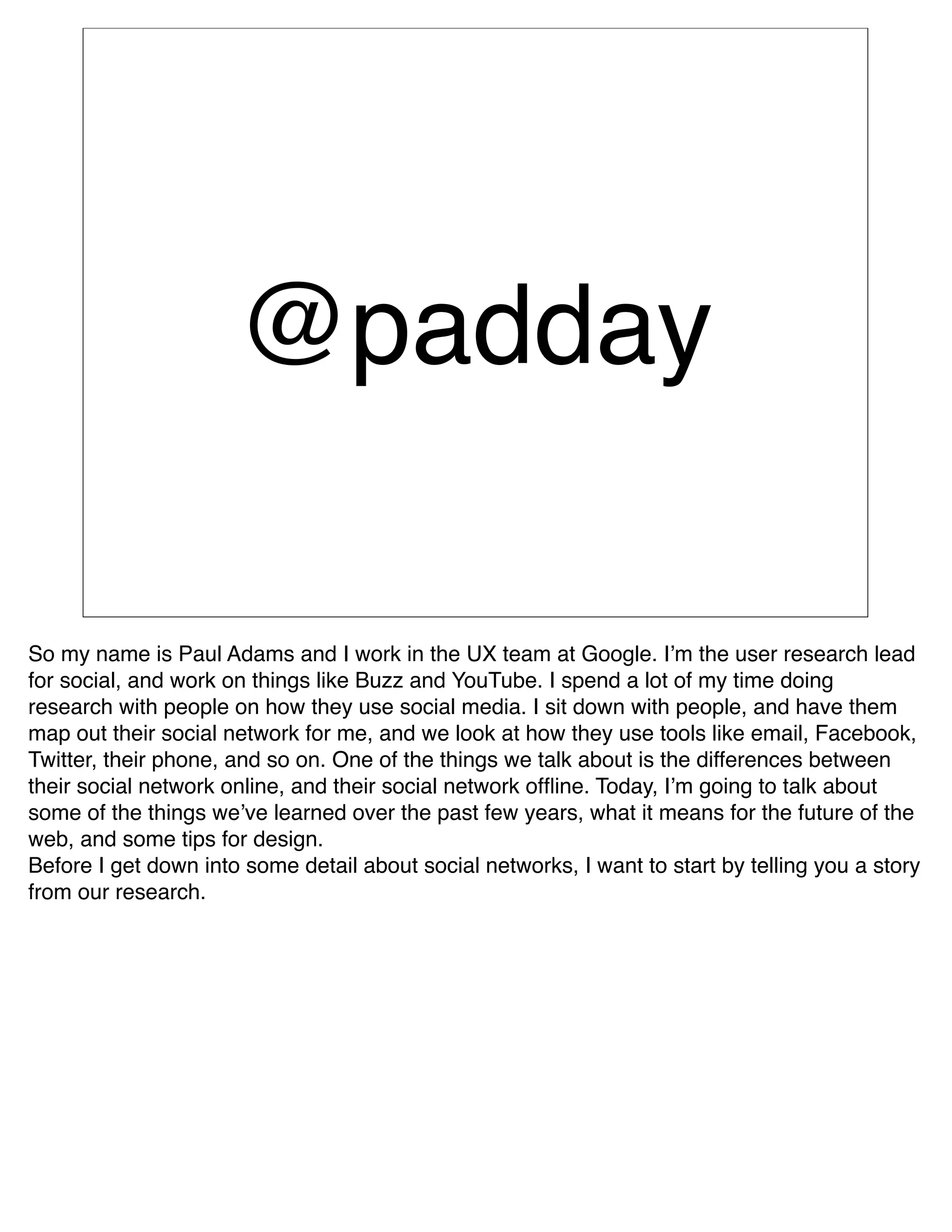 Paul Adams gave a presentation about social networks and how they differ online and offline. He told a story about a woman named Debbie who unintentionally shared photos from her personal life with her young students on Facebook because her online social network did not match her offline networks. Adams said the social web is fundamentally changing how people use the internet, with profiles and social networks integrating across different websites. He argued that almost all websites and apps will need to consider social features and connections between users.