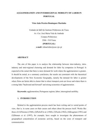 This document analyzes the relationship between inter-industry, intra-industry, and inter-regional clustering and the demand for labor by companies in Portugal. It develops an equation to model the relationship between the relative growth of regional employment in an industry and factors representing transportation costs, backward and forward linkages between industries, and agglomeration economies. The document uses statistical data on employment, wages, and goods flows for Portugal's five regions and nine manufacturing industries from 1986 to 1994 to estimate the model.