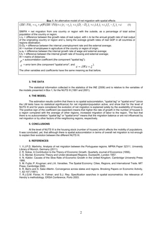 This document presents a model for analyzing net migration between Portuguese regions from 1991 to 2001. The empirical analysis finds that housing availability, measured as the growth rate in the number of houses in a region compared to other regions, is the main determinant of migration patterns between regions. Spatial autocorrelation tests find no influence of neighboring regions' net migration or other factors on a given region's migration rates. The model and results suggest housing supply was the primary driver of labor mobility between Portuguese regions during this time period.