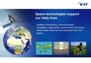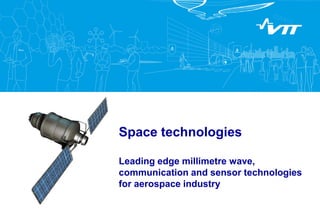 VTT has expertise in millimeter wave technologies, wireless communication systems, and sensing technologies developed over 20 years of working with ESA and space companies. They provide solutions such as antennas and RF components, communication systems, and sensors for applications in satellite communication, navigation, weather forecasting, and more. Their capabilities include designing, prototyping, and testing antennas, front-end modules, communication systems, and sensors up to terahertz frequencies.