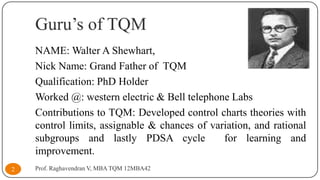The document discusses the key contributors to Total Quality Management (TQM). It profiles 8 quality gurus: Walter Shewhart, W. Edwards Deming, Joseph Juran, Armand Feigenbaum, Kaoru Ishikawa, Philip Crosby, Genichi Taguchi, and their major contributions to developing TQM principles and techniques. Their works involved developing concepts like control charts, Deming's 14 principles, Juran's trilogy, quality costs, PDCA cycle, loss functions, and quality circles that formed the basis of modern quality management approaches.