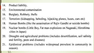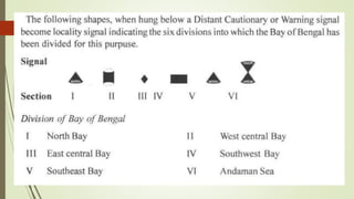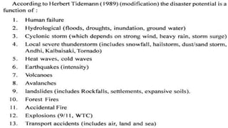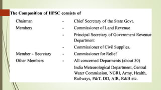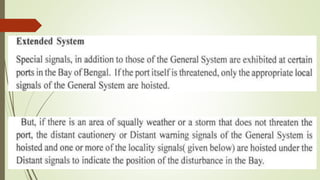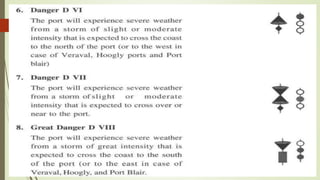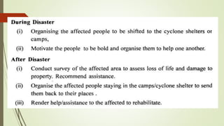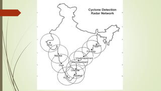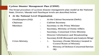 The document discusses cyclones and disaster management in India. It describes the India Meteorological Department's role in cyclone prediction and warning dissemination. The IMD issues four stages of cyclone warnings through various communication channels including satellite, and provides port authorities with day and night warning signals. At the state level, disaster management involves government officials and voluntary organizations to prepare for, respond to, and help communities recover from cyclones and other hazards through early warning systems, cyclone shelters, and evacuation plans. Vulnerability reduction measures aim to lessen the potential impacts of cyclones.