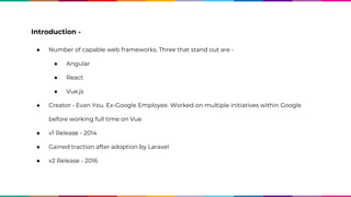 This document provides an overview of the Vue.js framework. It discusses Vue's creator, key features like components and directives, state management with Vuex, common library integrations, and adoption trends. The document uses examples to demonstrate the simplicity of Vue compared to React and Angular, covering topics like data binding, conditional rendering, and lists. It also outlines Vue's architecture including components, stores, getters, mutations, and actions.