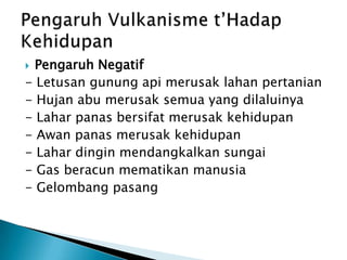 PengaruhNegatif- Letusan gunungapi merusak lahan pertanian- Hujan abu merusak semua yang dilaluinya- Laharpanasbersifatmerusakkehidupan- Awanpanasmerusakkehidupan- Lahardinginmendangkalkansungai- Gas beracunmematikanmanusia- GelombangpasangPengaruhVulkanismet’HadapKehidupan