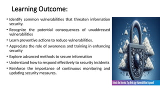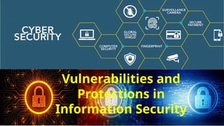 The document discusses vulnerabilities and protections within information security, outlining common vulnerabilities, including software, hardware, and human-related threats, as well as advanced protections like zero trust architecture. It emphasizes the importance of proactive vulnerability management processes, continuous monitoring, and the integration of various protective measures to enhance security. Ultimately, it advocates for a comprehensive approach that combines technical, procedural, and physical safeguards to safeguard data integrity, confidentiality, and availability.