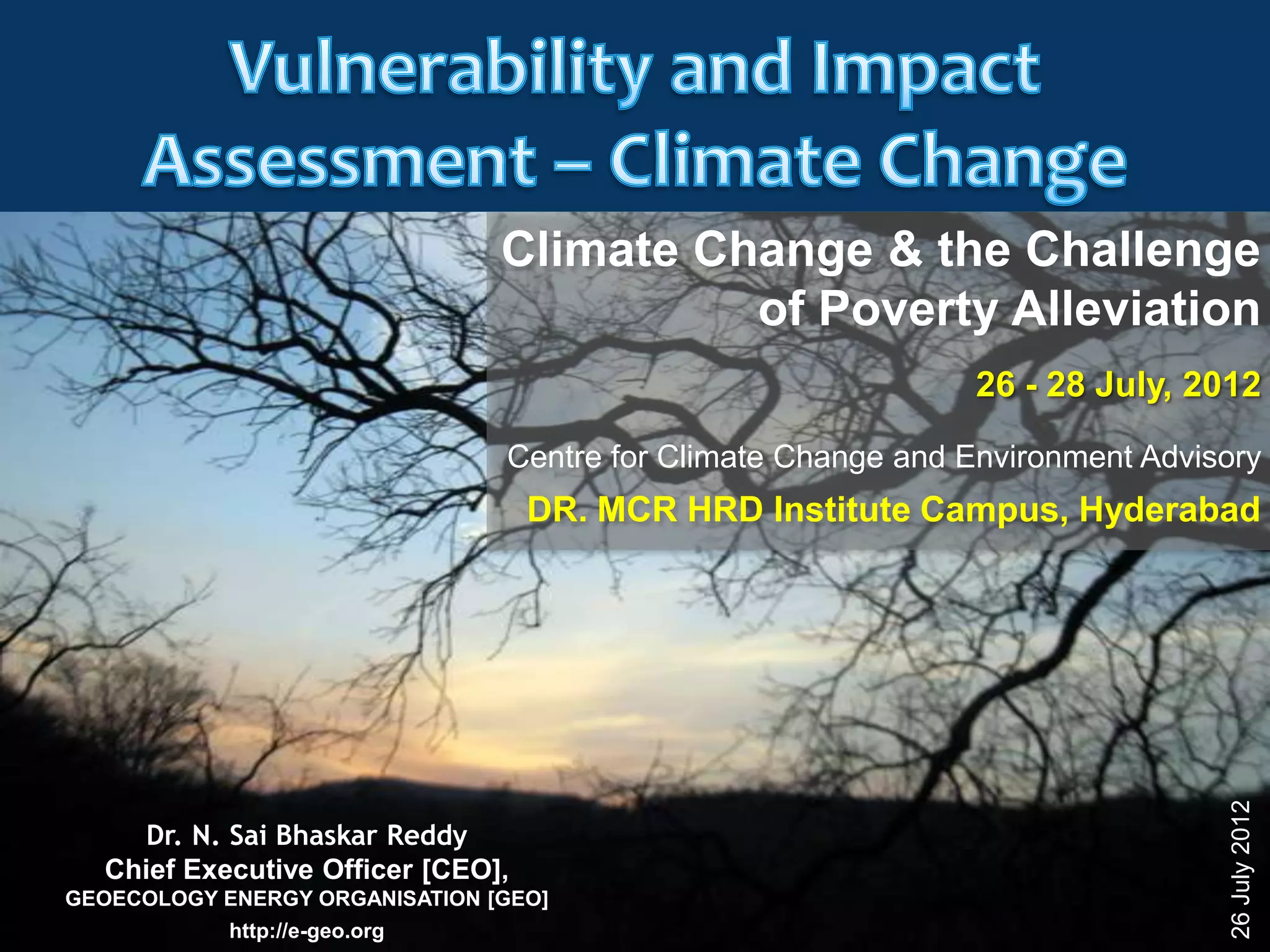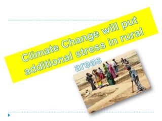 The document discusses how climate change and variability impacts poverty alleviation efforts, with a focus on vulnerability assessments and enhancing adaptive capacity. It provides information on climate trends in India, the national action plan to address climate change, and strategies to improve rural livelihoods and agricultural resilience through integrated approaches at the community level. The challenges of climate change, soil health, water management, and energy access for rural populations are examined.
