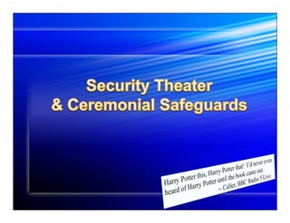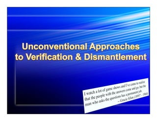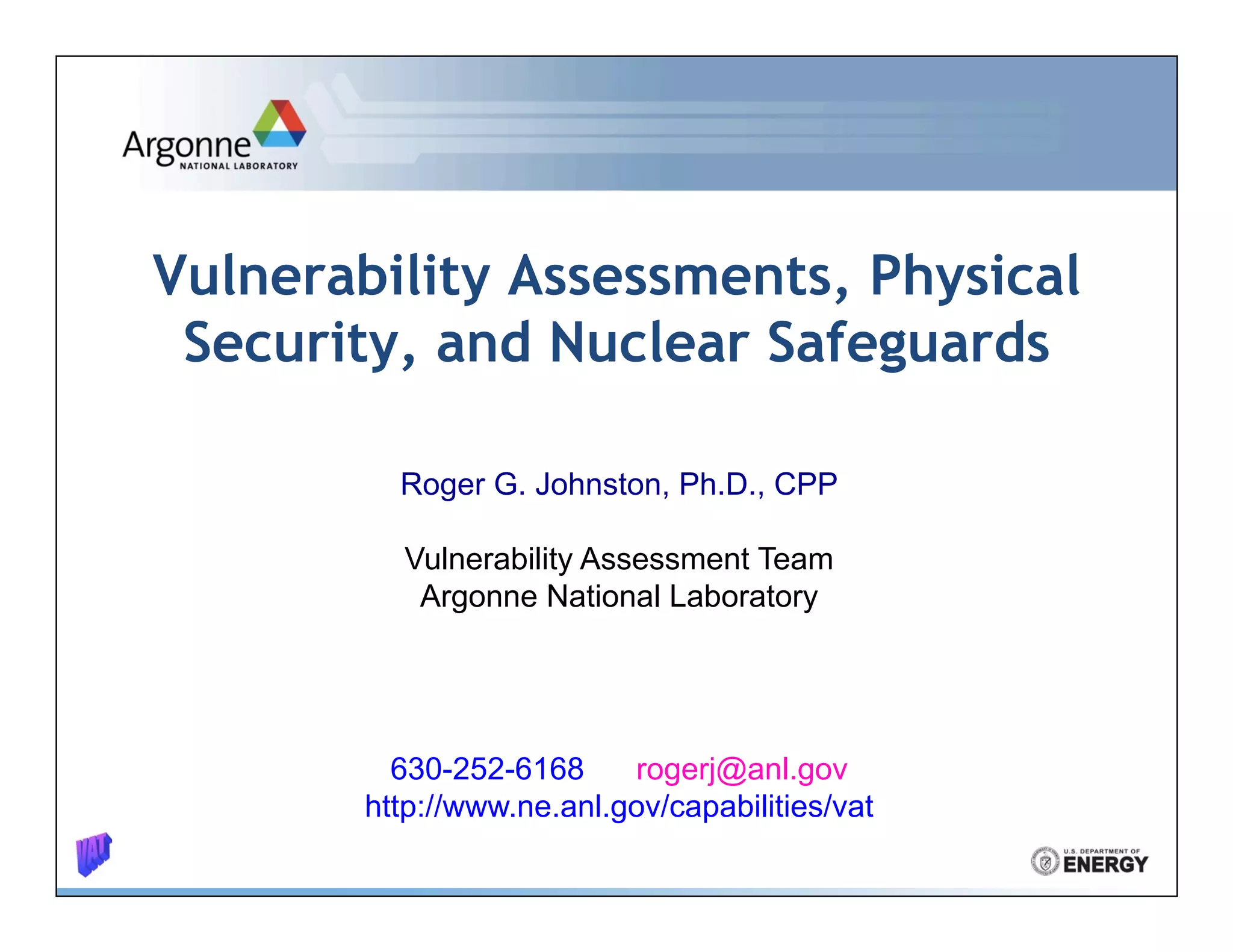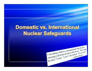 This document discusses vulnerability assessments of security and safeguard devices and programs. It describes how vulnerability assessments have been conducted on over 1,000 different systems and devices. It outlines some key differences between domestic and international nuclear safeguard programs and notes that similar hardware and strategies are sometimes incorrectly used for both applications. It also discusses several common problems with international safeguard programs and outlines attributes of "security theater".