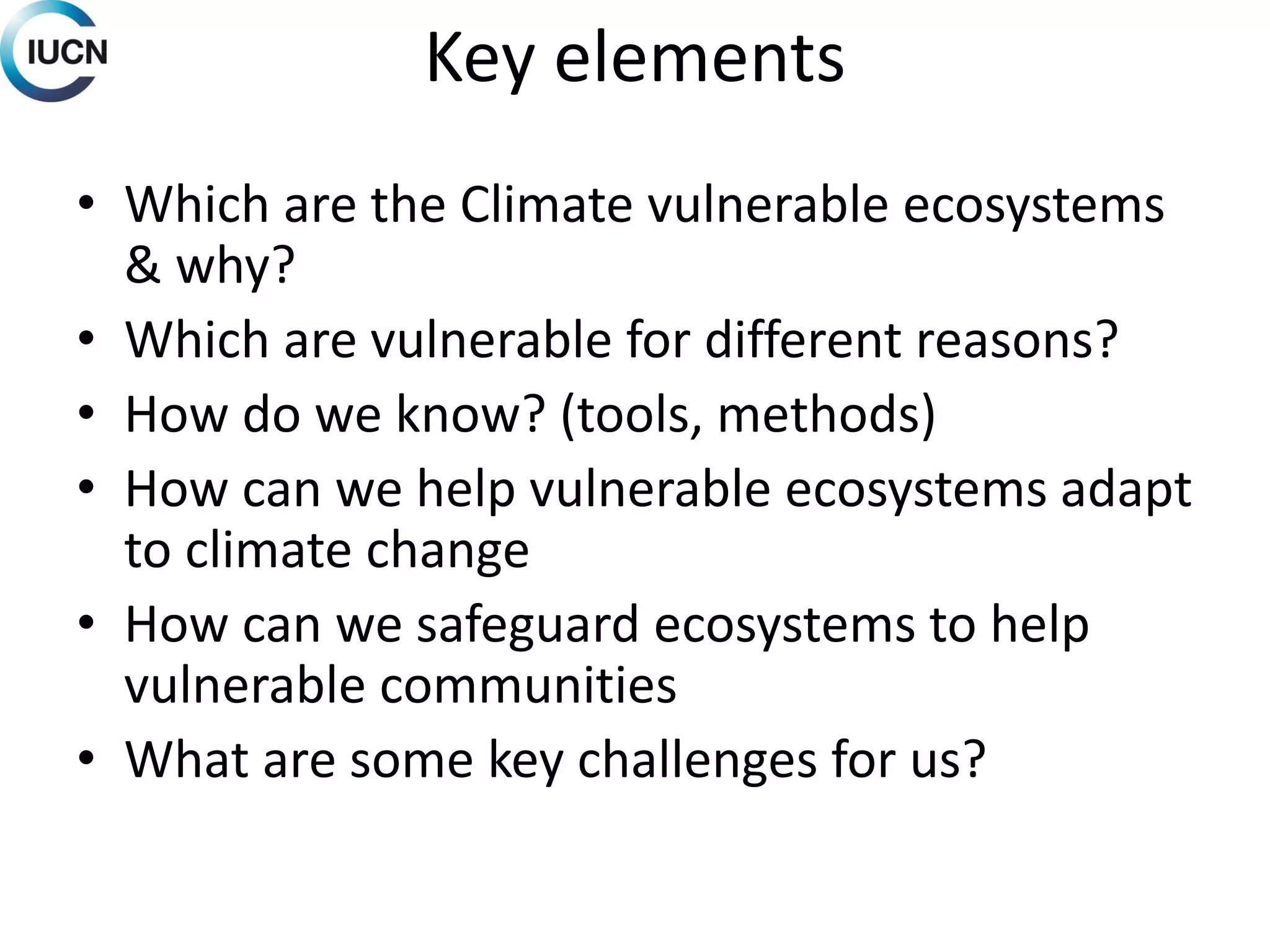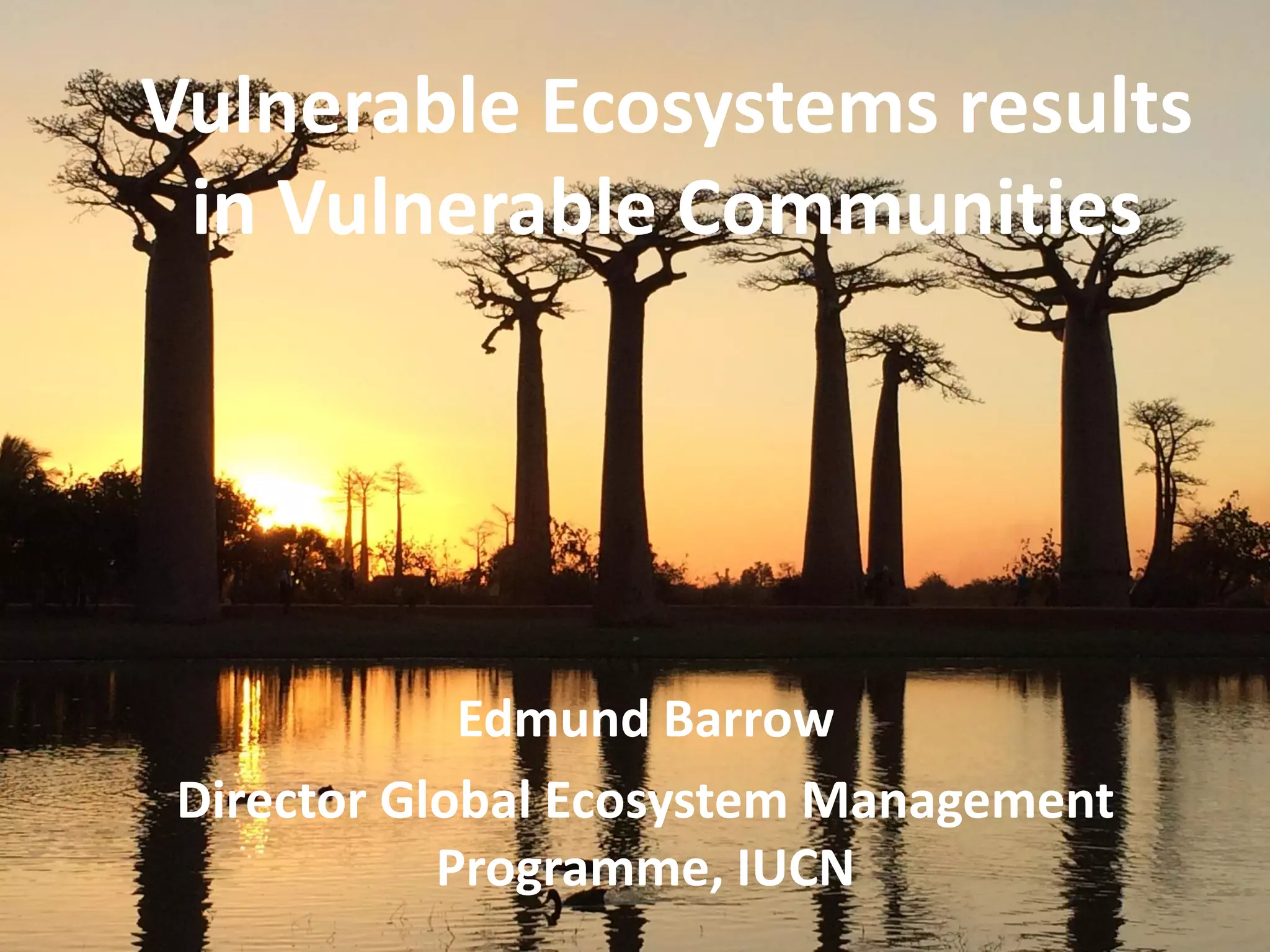 The document discusses the vulnerability of ecosystems due to climate change and human influences, highlighting various ecosystems at risk such as mountains, coral reefs, and drylands. It emphasizes the necessity of assessing these vulnerabilities and implementing strategies for adaptation, including climate-smart agriculture and ecosystem restoration. Key challenges include integrating ecosystem considerations into adaptation planning to enhance community resilience and mitigate risks from climate-related threats.