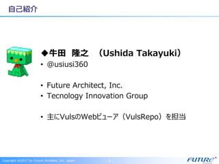 Future Architect, Inc. Japan - 2 - 牛田 隆之 (Ushida Takayuki) • @usiusi360 • Future Architect, Inc. • Tecnology Innovation Group • 主にVulsのWebビューア(VulsRepo)を担当
