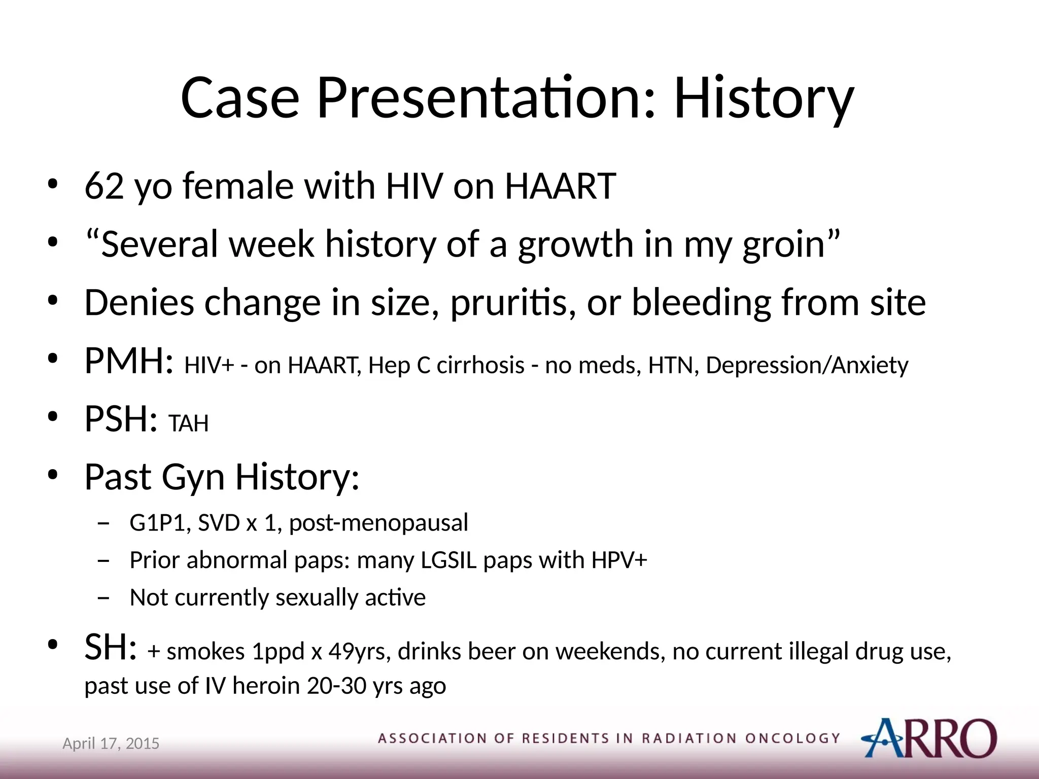 • Genitourinary: Vagina: White, adherent lesion 2x 3cm at