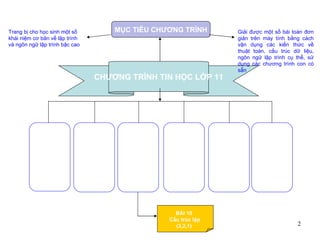 Tài liệu trình bày về chương trình tin học lớp 11, tập trung vào cấu trúc lặp trong lập trình Pascal. Các mục tiêu bao gồm hiểu và vận dụng đúng cấu trúc lặp với số lần biết trước và kiểm tra điều kiện trước, cùng với việc mô tả thuật toán của các bài toán có sử dụng lệnh lặp. Tài liệu cung cấp hướng dẫn cho giáo viên về cách thực hiện bài giảng và các hoạt động học tập cho học sinh để củng cố kiến thức.