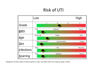 Vesicoureteric reflux (VUR) is a common condition in children where urine flows backward from the bladder into the ureters or kidneys. It can lead to urinary tract infections and renal scarring. The document discusses the anatomy, pathophysiology, diagnosis and management of VUR. Management involves continuous antibiotic prophylaxis, endoscopic injection, or open surgical correction depending on the grade of reflux and individual patient factors. Spontaneous resolution is more likely for lower grades of reflux and in younger children. Bowel and bladder dysfunction can complicate management and decrease resolution rates.