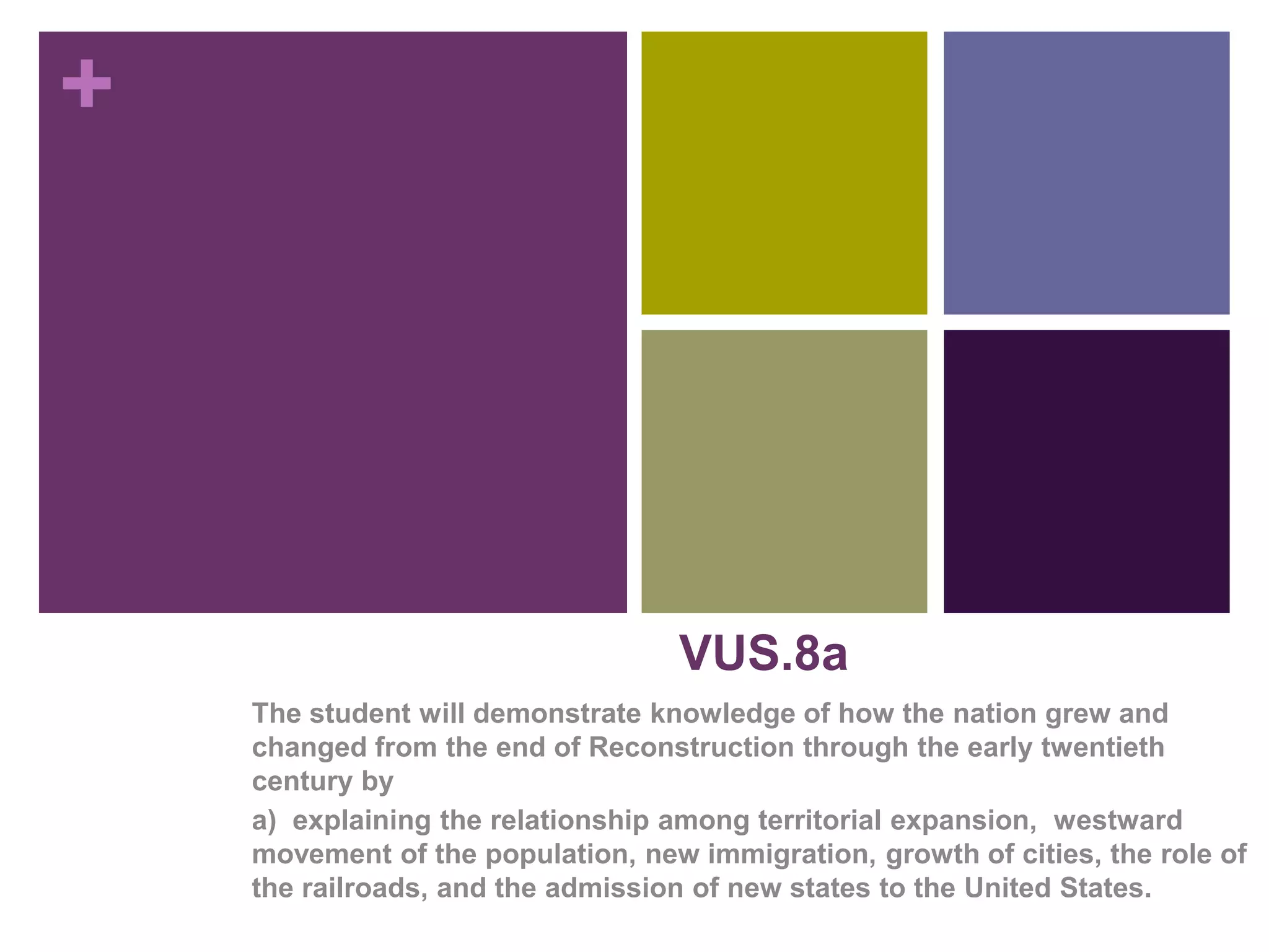 The document provides information on how the United States grew and changed from the end of Reconstruction through the early 20th century. It discusses several key factors that influenced this period of growth and expansion, including territorial expansion and westward movement of settlers, new waves of immigration, rapid growth of cities and urbanization, the role of railroads, and the admission of new states. Technological advances and inventions like the railroad, mechanical reaper, and telegraph opened up new lands and markets, fueling further expansion.