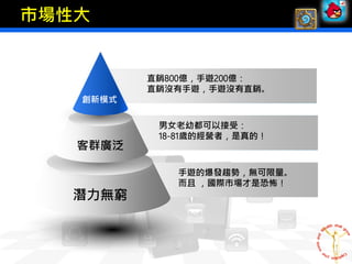 男女老幼都可以接受: 18-81歲的經營者,是真的! 直銷800億,手遊200億: 直銷沒有手遊,手遊沒有直銷。 手遊的爆發趨勢,無可限量。 而且 ,國際市場才是恐怖! 創新模式 客群廣泛 潛力無窮 市場性大