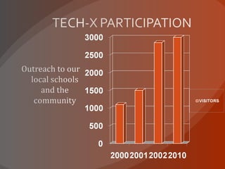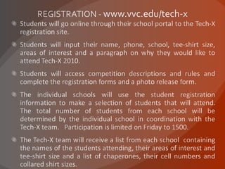 Schools attending Tech-X in May 2010 will receive packets with information for bus drivers, chaperones, and contest participants. The bus driver packets will include arrival times and parking details. Chaperone packets will include maps, rules, and collared shirts to wear each day. Students will be given colored wristbands and shirts to wear and will receive lunch if wearing the items. Contest participant packets will include competition times and locations for May 8th.