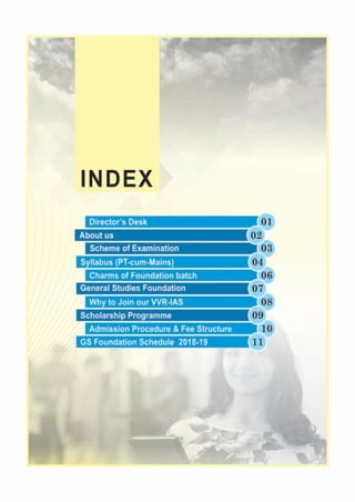 The document outlines the curriculum for the 2018-19 GS foundation batch, detailing various subjects including polity, history, geography, and ethics, scheduled with a specific number of classes and duration. Each subject is accompanied by topics covered, recommended sources, and educational objectives, focusing on key areas such as governance, societal issues, and environmental challenges. It emphasizes a proactive learning approach with pre-class materials and self-evaluation through tests to enhance students' understanding and analytical skills.