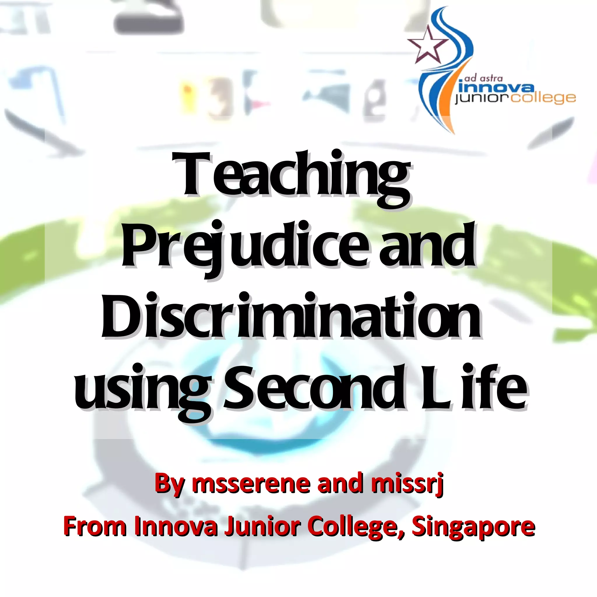 The document outlines a curriculum initiative by lecturers at Innova Junior College in Singapore to teach prejudice and discrimination through the virtual world of Second Life. By immersing students in a fictional city called Maletopia, where they assume the roles of avatars with unique perspectives, the program aims to foster critical thinking about complex social issues such as male choice priority. The course will commence in April 2012 and will involve debates and analysis to enhance understanding of these themes among grade 11-12 students preparing for their A-level examinations.