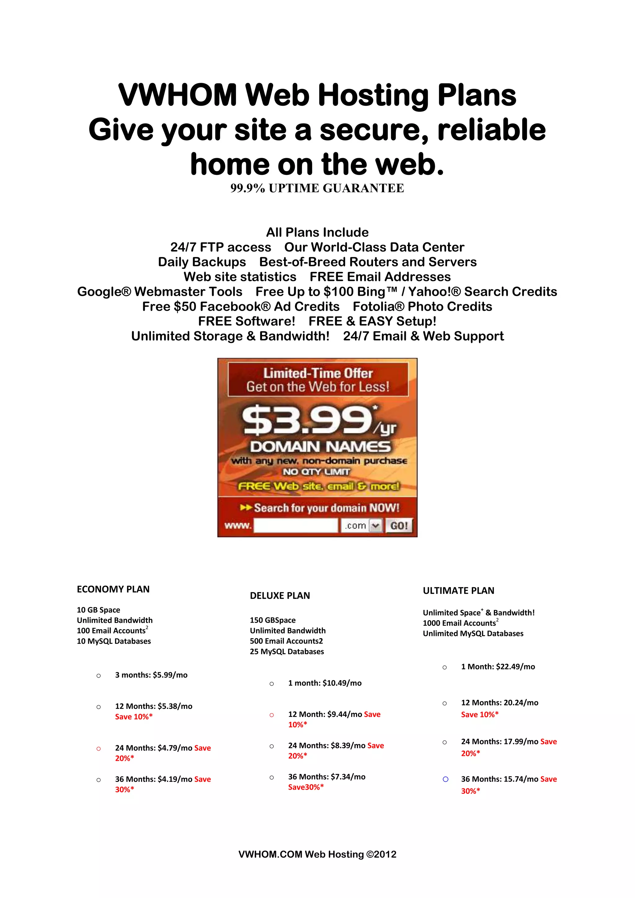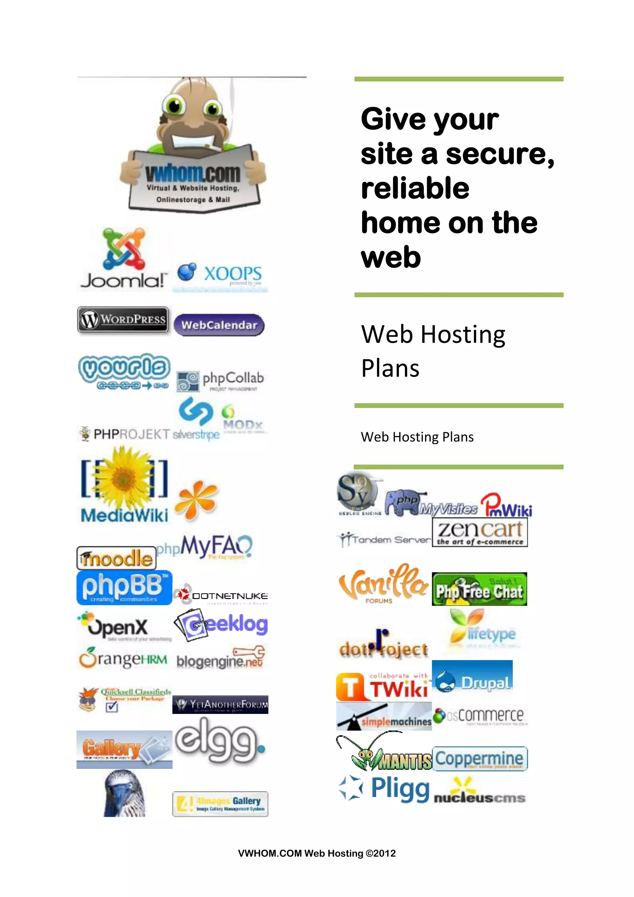 This document provides information on various web hosting plans from VWHOM.COM. It includes three hosting plan options (Economy, Deluxe, and Ultimate) that differ in included space, bandwidth, email accounts, databases, and pricing. All plans offer 99.9% uptime, 24/7 support, and free software and setup. The document also lists and provides brief descriptions of various open source content management systems, forums, galleries, and other software that can be used with the hosting plans.