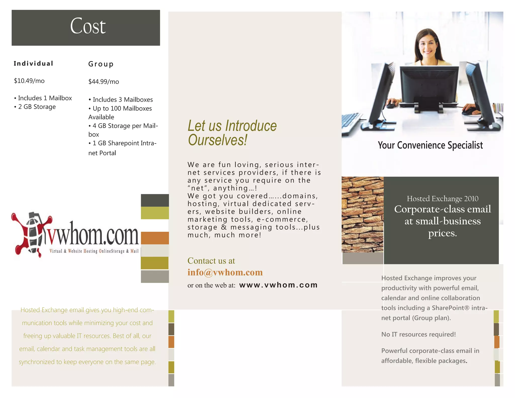 The document compares the individual and group plans for VWHOM.COM Hosted Exchange email services. The individual plan costs $10.49/month and includes 1 mailbox and 2GB of storage. The group plan costs $44.99/month and includes up to 100 mailboxes with 4GB of storage per mailbox and a 1GB SharePoint intranet portal. Both plans provide corporate-class email tools with anytime access and calendar sharing without requiring internal IT resources.