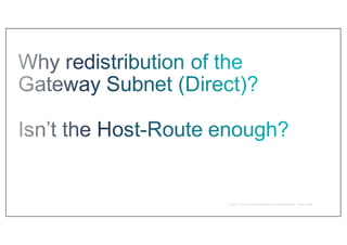 VXLAN Design and Deployment discusses considerations for deploying VXLAN in a data center fabric. It covers why VXLAN is used to create overlay networks, VXLAN fundamentals like encapsulation and tunneling, and important factors for the underlay network like ensuring sufficient MTU for the VXLAN overhead, using point-to-point interfaces and protocols like OSPF or IS-IS for routing, enabling IP multicast, and deploying iBGP with a route reflector to distribute VTEP reachability. The document also discusses control plane protocols, evolution of VXLAN, and hardware support on Cisco platforms.