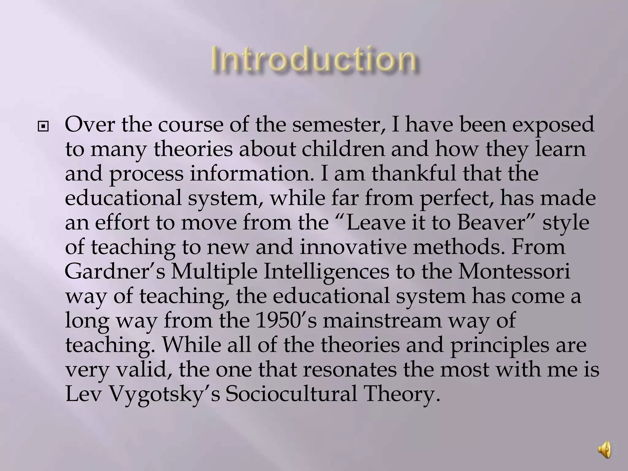The document discusses Lev Vygotsky’s sociocultural theory of learning. It states that Vygotsky believed that social interaction and culture are important for cognitive development in children. Children can learn more with assistance from others who are more capable. The Zone of Proximal Development describes skills children can learn with help that they cannot yet learn independently. The document advocates for implementing Vygotsky's theory through group work, with roles for peers, family, and community members to provide scaffolding to help children achieve educational goals.