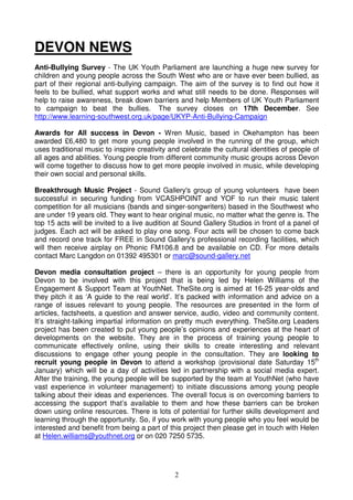 The document discusses a national citizen service program in Devon led by Young Devon. The program will provide places for 900 young people in 2011 to help with their transition to adulthood and encourage involvement in their local communities. Participants will engage in a two-week residential program and develop social action projects in their neighborhoods. The program aims to be flexible around school schedules to accommodate seasonal work.