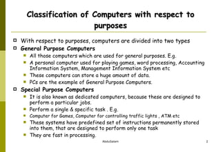 The document discusses different types of computer classification based on purpose, function, and size. General purpose computers can perform many different tasks while special purpose computers are designed to perform a single specific task. Based on function, computers are digital, analog, or hybrid. Classification by size includes microcomputers, minicomputers, mainframes, and supercomputers, with the latter being the most powerful and used for complex calculations.