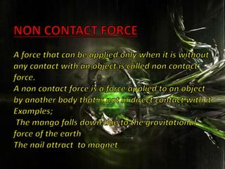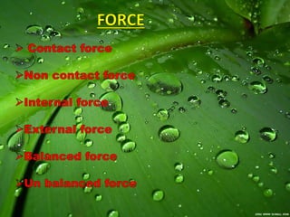 Force is any influence that causes an object to change its motion, shape, or state of rest. There are different types of forces, including contact forces that require touching an object, like pushing a table. Balanced forces occur when multiple forces cancel each other out, while unbalanced forces result in a net force that changes the motion of an object. Internal forces cause acceleration within an object due to its mass, while external forces interact with the environment and are needed to move objects.