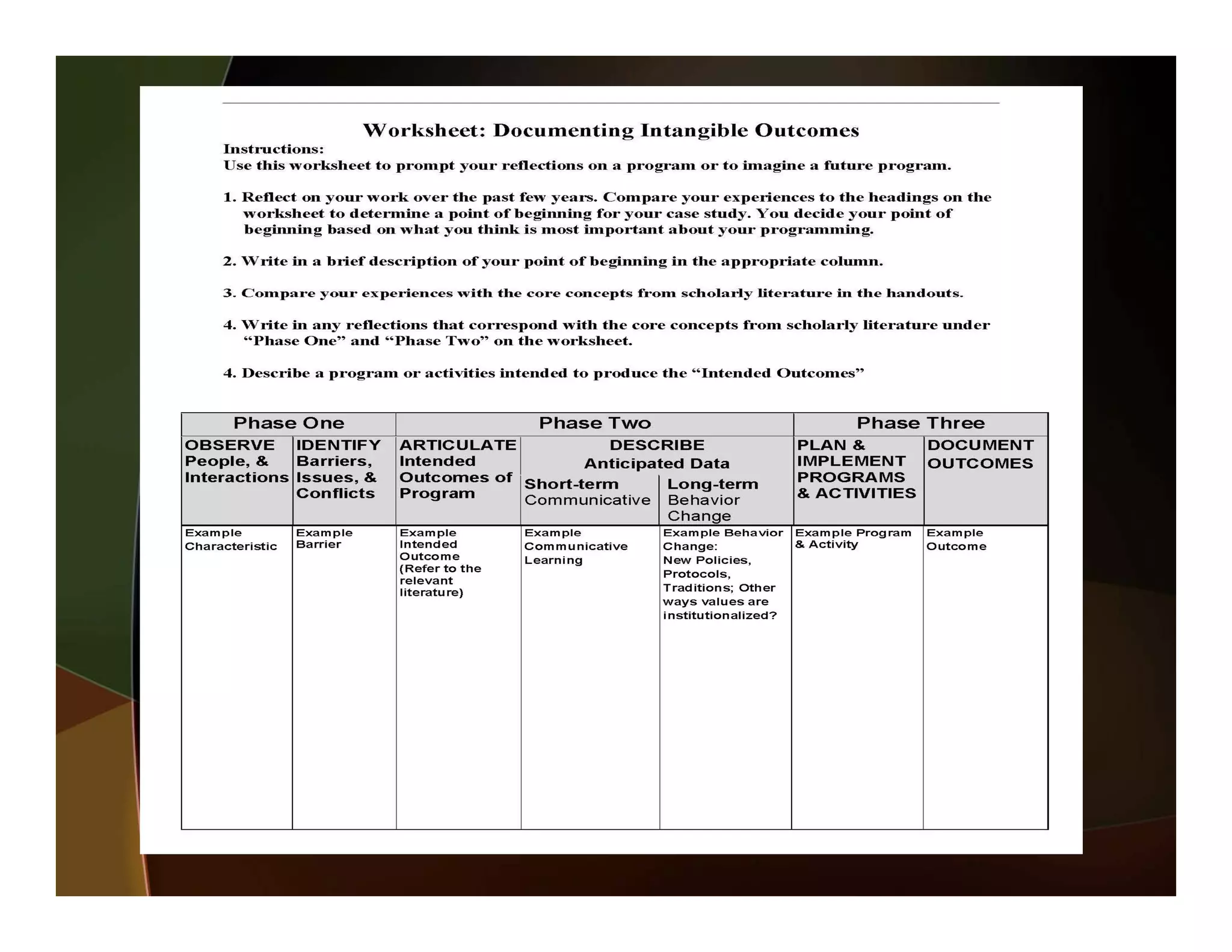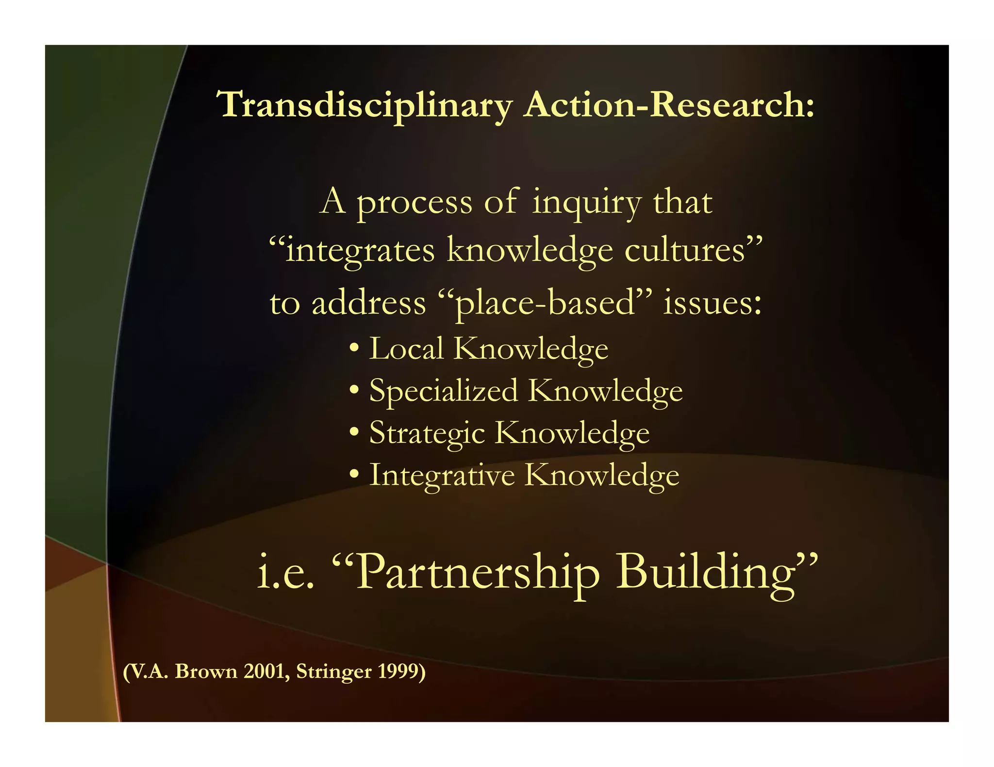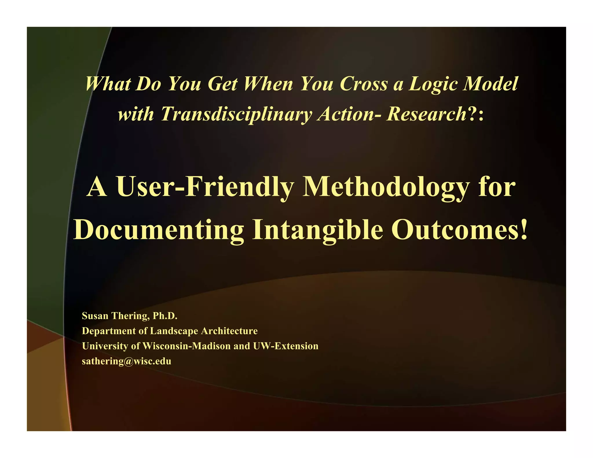 This document introduces a methodology for documenting intangible outcomes that combines a logic model with transdisciplinary action-research. Transdisciplinary action-research integrates different types of knowledge from local communities, experts, and stakeholders to address place-based issues through partnership building. The methodology was developed to evaluate the partnership building aspects of extension programming. It draws on concepts from the literature around community capacity, domains of learning, and cross-cultural learning. An example is provided from a green community development initiative that identified and overcame barriers to partnership. Attendees are thanked and asked to fill out evaluation forms.