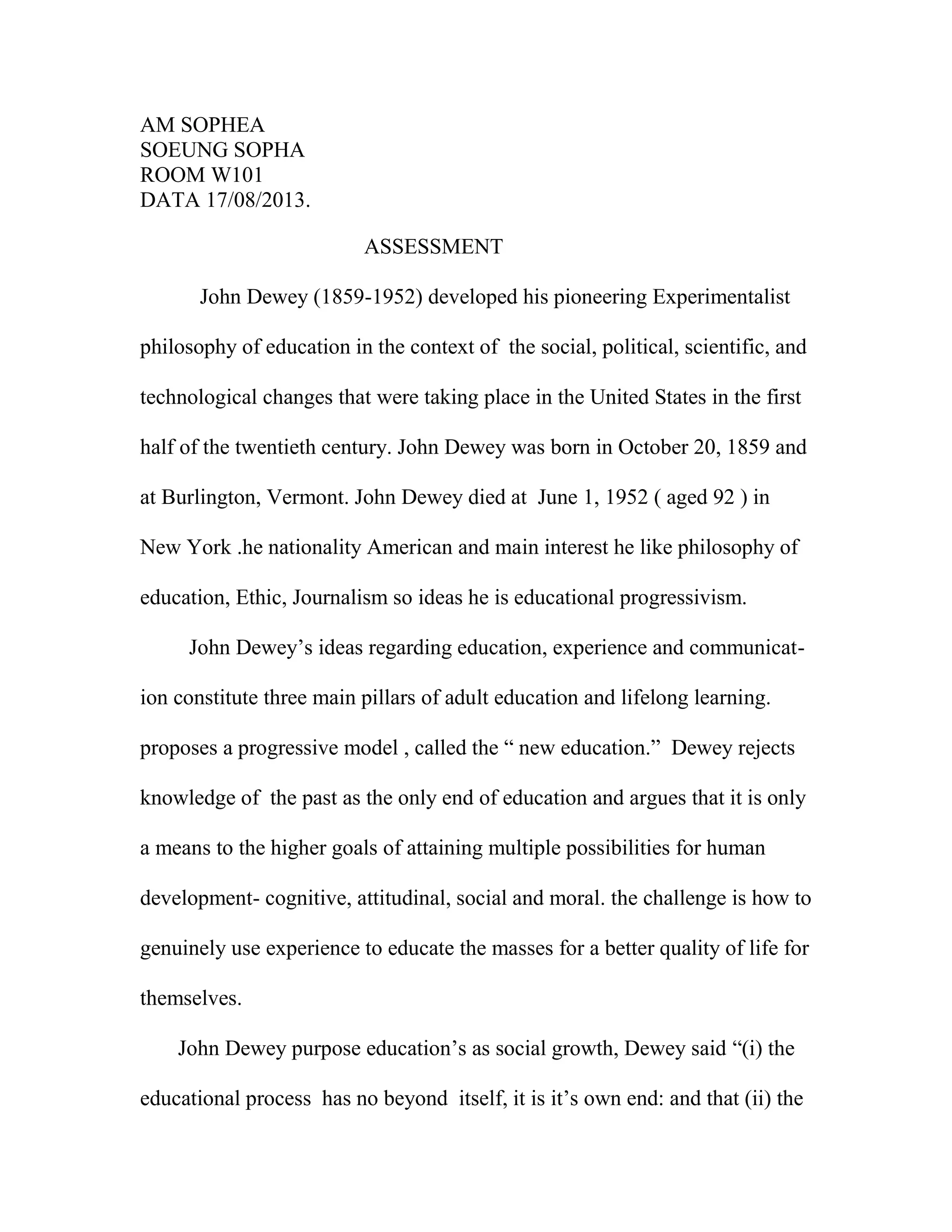 John Dewey (1859-1952) was an American philosopher and psychologist who developed the philosophy of educational progressivism. He believed that education should be experiential and focus on problem solving to stimulate growth. Dewey rejected the idea that education should only transmit past knowledge and instead argued it should cultivate human development through experience. He saw education as a means to social growth and believed the educational process is one of continual reconstruction as learners engage with their environment and solve problems.
