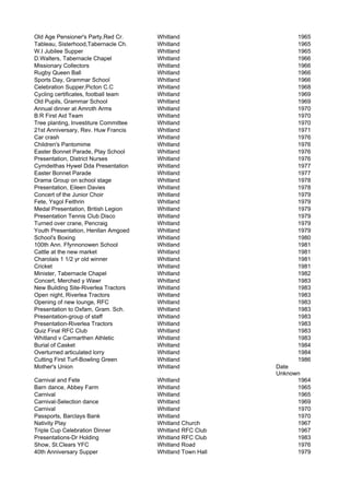 This document contains a list of over 150 events that took place in various towns in Wales between 1961-1986. The events include dinners, presentations, celebrations, school closures, church services, sports competitions and more. They took place in numerous locations such as hotels, inns, schools, churches, and other public buildings and venues.