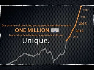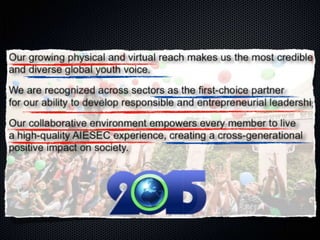 The document discusses the need for new models of leadership given today's complex, interconnected world. It describes AIESEC's mission to develop leadership through providing experiential learning opportunities for young people. AIESEC's goal is to engage and develop every young person worldwide by 2015 through their leadership development framework. The document emphasizes AIESEC members becoming the leaders that the world needs by fully contributing to and experiencing AIESEC's advanced leadership model.