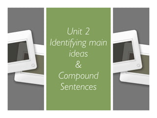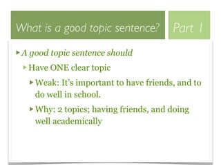 This document discusses topic sentences and compound sentences. It provides guidance on what makes a good topic sentence, including having a clear, specific topic and expressing an opinion. It also explains the different types of compound sentences joined by FANBOY conjunctions (for, and, nor, but, or, yet), including examples of sentences using addition, contrast, alternative, result and cause conjunctions. Rules for using commas with compound sentences are also outlined.