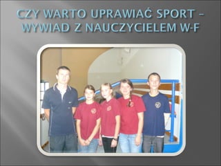 Wywiad z panemDominikiem Majchrzakiem-naszym w-f – istą: 1.Czy uważa pan, że warto uprawiać sport? D.M.-Tak jak najbardziej . 2.Co daje sport? D.M.-Zdrowie,relaksuje i pozwala zawierać nowe znajomości. 3.Jaką dyscyplinę sportu najchętniej uprawiają uczniowie? D.M.-Chłopcy piłkę nożną a dziewczyny siatk ó wkę i kosz. 4.Czy uczniowe chętnie ćwiczą? D.M.-Razcej nie.Z roku na rok tendencja idzie w d ó ł.