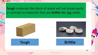 The document discusses properties of matter by categorizing them as either harmful or useful, focusing on both physical and chemical properties. It includes examples of properties like combustibility, toxicity, and malleability, encouraging identification and classification of materials based on their characteristics. Additionally, it emphasizes the importance of understanding product labels to determine the safety and utility of household items.