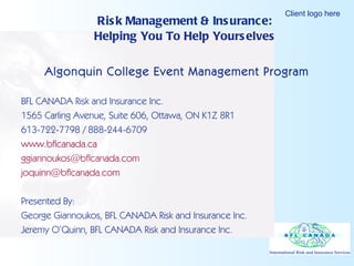 This document summarizes risk management and types of insurance relevant for event management. It discusses the five steps of risk management: identify risks, assess risk potential, prioritize risks, implement controls, and evaluate results. Common risks for festivals include slip and falls, attractive nuisances, and liquor liability. It also outlines types of insurance like general liability, directors' liability, event cancellation, and others. Minimizing claims involves proper documentation like certificates of insurance and waivers.