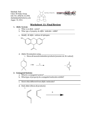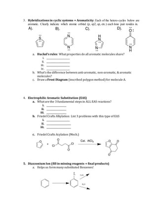 The document is a study guide for a chemistry exam covering various organic chemistry topics including allylic and conjugated systems, aromaticity, electrophilic aromatic substitution, carbonyl chemistry, amino acids, and peptide sequencing. It provides definitions, reaction mechanisms, and practice problems for key concepts that will be tested. The study guide emphasizes memorizing fundamental steps and rules for different reaction types as well as clearly indicating hybridizations and understanding how underlying concepts link various topics together. It concludes by recommending getting sufficient rest before the exam and trusting one's conceptual understanding of material to answer problems, even those involving unfamiliar reactions.
