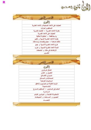 _ Iﺍﻟﻤﻮﺷﻮﺭ ﺍﻟﻘﺎﺋﻢ : 1( – ﺗﻌﺮﻳﻒ : ﺍﻟﻤﻮﺷﻮﺭ ﺍﻟﻘﺎﺋﻢ ﻫﻮ ﻣﺠﺴﻢ ﻳﺘﻜﻮﻥ ﻣﻦ : 1( – ﻭﺟﻬﻴﻦ ﻣﺘﻮﺍﺯﻳﻴﻦ ﻗﺎﺑﻠﻴﻦ ﻟﻠﺘﻄﺎﺑﻖ ﻫﻤﺎ : ﻗﺎﻋﺪﺗﺎﻥ ﺍﻟﻤﻮﺷﻮﺭ ﺍﻟﻘﺎﺋﻢ . 2( – ﺃﺣﺮﻑ ﺟﺎﻧﺒﻴﺔ ﻣﺘﻘﺎﻳﺴﺔ ﻫﻲ : ﺍﺭﺗﻔﺎﻉ ﺍﻟﻤﻮﺷﻮﺭ ﺍﻟﻘﺎﺋﻢ . 3( – ﺃﻭﺟﻪ ﺟﺎﻧﺒﻴﺔ ﻭ ﻫﻲ ﻋﻠﻰ ﺷﻜﻞ : ﻣﺴﺘﻄﻴﻼﺕ . * ﻣﻼﺣﻈﺎﺕ ﻫﺎﻣﺔ : 1( – ﻋﺪﺩ ﺍﻷﻭﺟﻪ ﺍﻟﺠﺎﻧﺒﻴﺔ ﻟﻤﻮﺷﻮﺭ ﻗﺎﺋﻢ ﻳﺴﺎﻭﻱ ﻋﺪﺩ ﺃﺿﻼﻉ ﻗﺎﻋﺪﺗﻪ . ﻞ ﻣﺜﻠﺚ ﺃﻭ ﻣﺮﺑﻊ ﺃﻭ ﻣﺴﺘﻄﻴﻞ ﺃﻭ ﻣﻀﻠﻊ ﺭﺑﺎﻋﻲ 2( – ﻗﺎﻋﺪﺗﺎ ﺍﻟﻤﻮﺷﻮﺭ ﺍﻟﻘﺎﺋﻢ ﺇﻣﺎ ﺃﻥ ﺗﻜﻮﻧﺎ ﻋﻠﻰ ﺷﻜ ﺃﻭ ﻣﻀﻠﻊ ﺧﻤﺎﺳﻲ .......... 2( – ﺃﻣﺜﻠــﺔ : ( ﻣﻮﺷﻮﺭ ﻗﺎﺋﻢ ﻗﺎﻋﺪﺗﺎﻩ ﻣﺜﻠﺚ : ﺃ ﺍﻟﻘﺎﻋﺪﺗﺎﻥ ﻫﻤﺎ : ﺍﻟﻤﺜﻠﺜﺎﻥ ABCﻭ . DEF ﺍﻷﺣﺮﻑ ﺍﻟﺠﺎﻧﺒﻴﺔ ﻫﻲ : ]. [CF] [BE] [AD ﻭ ﻭ ﺍﻷﻭﺟﻪ ﺍﻟﺠﺎﻧﺒﻴﺔ ﻫﻲ : ﺍﻟﻤﺴﺘﻄﻴﻼﺕ ADFC ﻭ ADEBﻭ . BEFC ( ﻣﻮﺷﻮﺭ ﻗﺎﺋﻢ ﻗﺎﻋﺪﺗﺎﻩ ﻣﺴﺘﻄﻴﻞ : ﺏ ﺍﻟﻘﺎﻋﺪﺗﺎﻥ ﻫﻤﺎ : ﺍﻟﻤﺴﺘﻄﻴﻼﻥ ABCDﻭ . EFGH ﺍﻷﺣﺮﻑ ﺍﻟﺠﺎﻧﺒﻴﺔ ﻫﻲ : ][DH] [CG] [BF] [AE ﻭ ﻭ ﻭ . ﺍﻷﻭﺟﻪ ﺍﻟﺠﺎﻧﺒﻴﺔ ﻫﻲ : ﺍﻟﻤﺴﺘﻄﻴﻼﺕ DCGH AEHD ﻭ . ABFE BCGF ﻭ ﻭ ﻲ ﻫﺬﺍ ﺍﻟﻤﻮﺷﻮﺭ ﺍﻟﻘﺎﺋﻢ : ﻣﺘﻮﺍﺯﻱ ﺍﻟﻤﺴﺘﻄﻴﻼﺕ ﺍﻟﻘﺎﺋﻢ . ﻧﺴﻤ