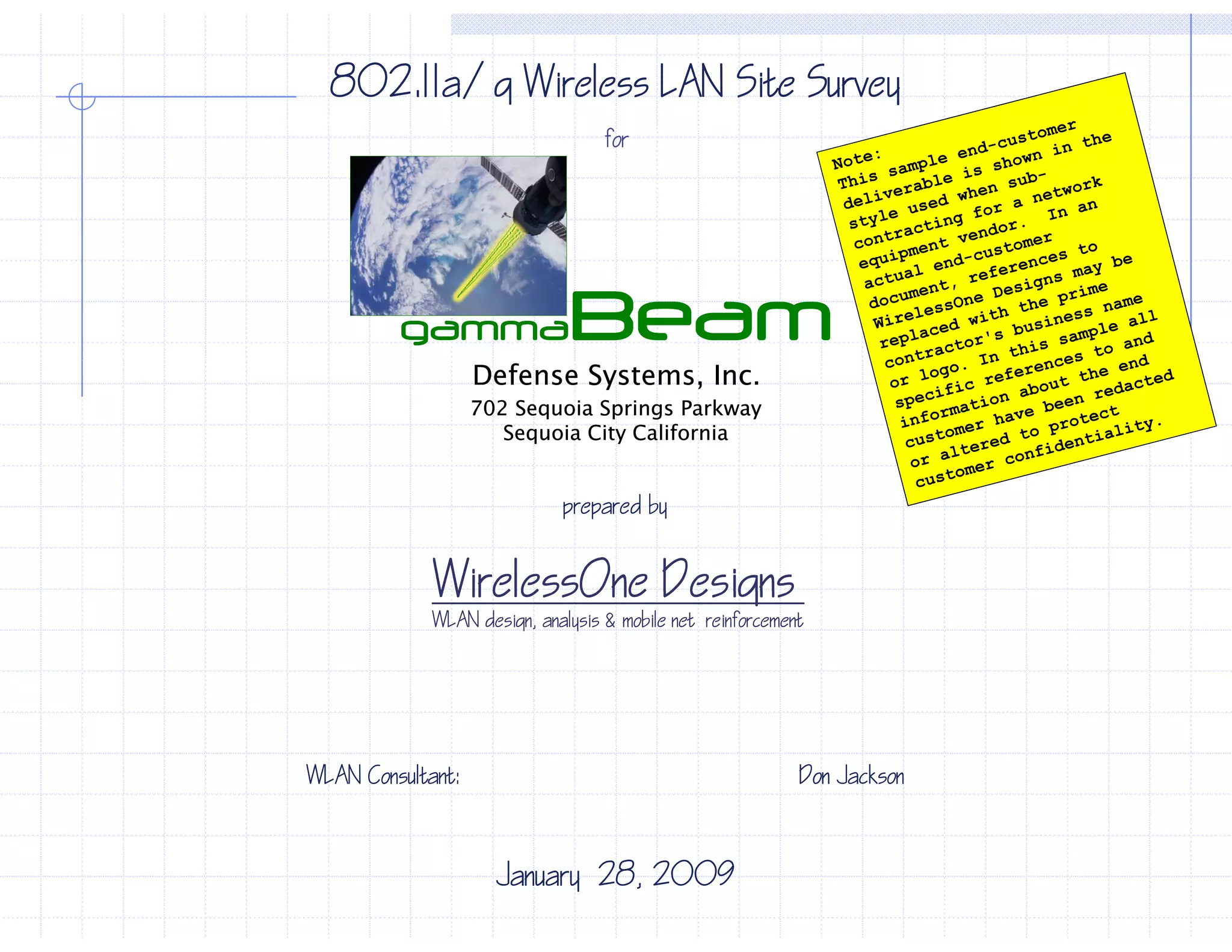 This document provides a wireless LAN site survey and design for Gamma Beam Defense Systems. It analyzes the site using computer modeling and on-site testing to develop a design using Cisco 1240AG access points and external antennas. The design targets a minimum signal strength of -67 dBm throughout indoor areas to support current and future WiFi clients, including VoWLAN phones. Spectrum analysis found moderate to high interference from various sources. The recommended design uses a combination of low and medium gain omni-directional and directional antennas mounted on walls and ceilings to provide reliable coverage.