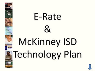 The document summarizes McKinney Independent School District's use of E-Rate funds and its technology plan. It explains that E-Rate provides funds from the Universal Service Fund to pay for telecommunications services, internet access, and internal connections. McKinney ISD qualifies for these funds by having a certain percentage of students eligible for the national school lunch program and by submitting a technology plan and application. The technology plan sets goals in areas like academic achievement, business operations, and infrastructure to guide the district's technology integration and use of E-Rate funds over five years.