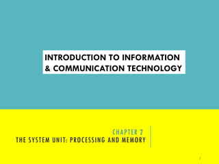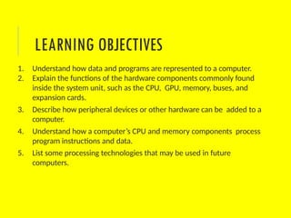 The document outlines the key components and functions of a computer's system unit, including processing and memory elements like the CPU, GPU, and RAM. It explains how data and programs are represented in a digital format, along with various coding systems such as ASCII and Unicode. Additionally, it discusses the future of computing technologies including quantum and optical computing, as well as strategies for enhancing system performance.